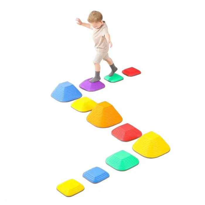 Ogni pedana presenta una superficie a gradino che permette di sperimentare appoggi differenti, aiutando i più piccoli a sviluppare il controllo motorio e la percezione spaziale. Le basi antiscivolo assicurano stabilità durante l’attività, mentre i colori vivaci attirano l’attenzione e incoraggiano il gioco attivo.