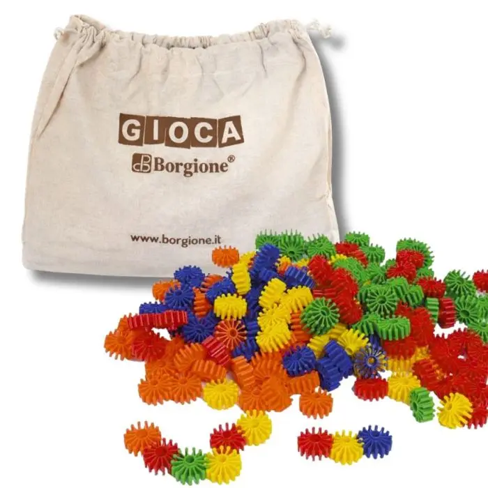 Ruote dentate a incastro semplicissimo. La presa facile dei singoli elementi stimola la creatività dei bambini nel comporre costruzioni libere e fantastiche. Realizzati in materiale plastico infrangibile e con spigoli arrotondati. Concedere ai piccoli momenti di gioco non strutturato gli permette di sviluppare le abilità creative, logiche e cognitive, rispettando i tempi di crescita di ciascuno.