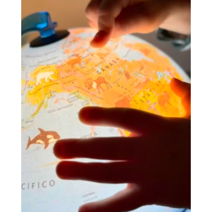 Globo da tavolo con diametro 30 cm che raffigura animali emblematici e monumenti famosi di ogni Paese, trasformando lo studio della geografia in un viaggio visivo e narrativo. La sfera ruota fluidamente sul meridiano blu petrolio, invitando bambini e ragazzi a scoprire habitat, specie e capolavori dell’umanità semplicemente con un dito; il libretto illustrato incluso arricchisce l’esperienza con curiosità e aneddoti, stimolando lettura, memoria e spirito d’esplorazione. Il cavo di alimentazione (luce interna non inclusa nella descrizione) consente di illuminarlo come lampada atmosferica durante ricerche o racconti serali, rendendolo un oggetto funzionale tanto in classe quanto in camera.