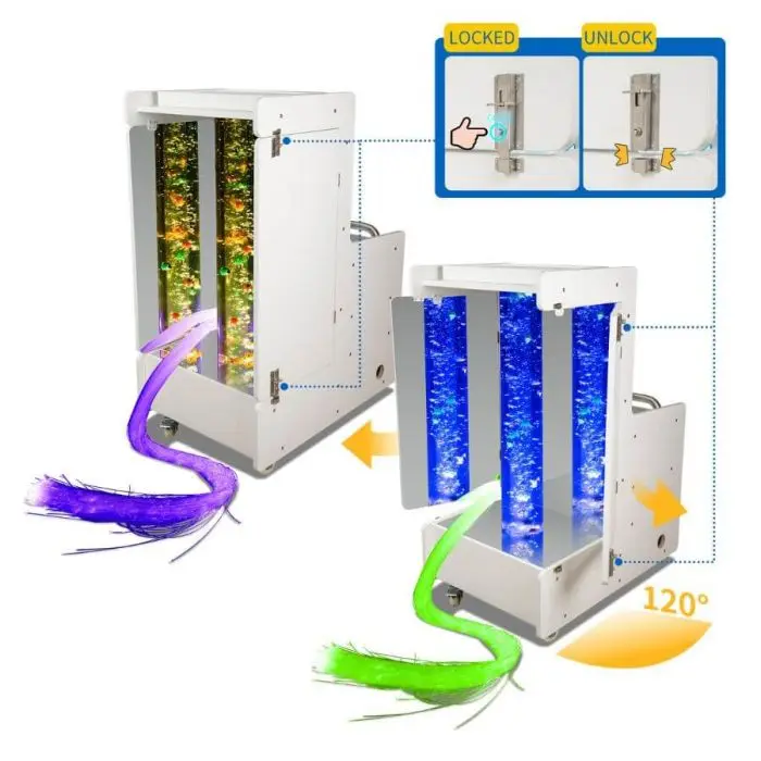 Stanza sensoriale portatile, benessere multisensoriale dove serve, quando serve! Questa struttura compatta su ruote trasforma qualunque ambiente in un’accogliente area Snoezelen, concentrando gli stimoli visivi e tattili tipici di una stanza multisensoriale. Le ante frontali si aprono svelando un tubo a bolle, incorniciato da specchi che moltiplicano luci, colori e movimento dell’acqua, favorendo il rilassamento e il potenziamento dell’attenzione.